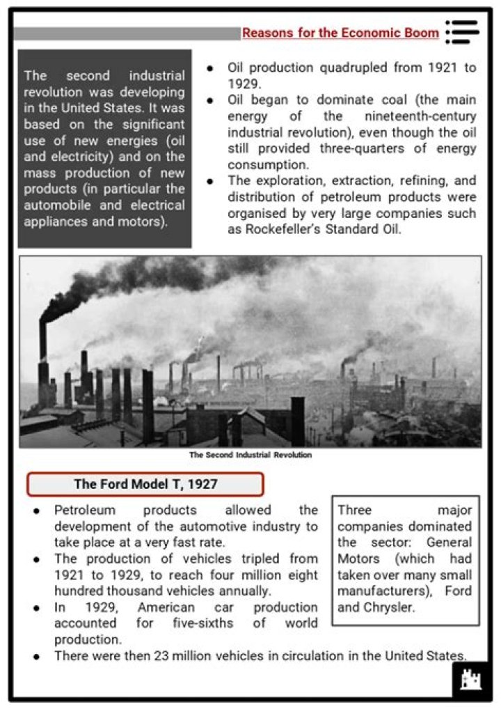 During the 1920s, revolutionary mass-production techniques enabled American workers to produce more goods in less time. Because of this, the economy boomed. The automobile industry played a major role in the boom. Carmaker Henry Ford introduced new methods and ideas that changed the way manufactured goods were made.