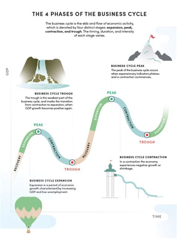 The economic cycle is the fluctuation of the economy between periods of expansion (growth) and contraction (recession). Factors such as gross domestic product (GDP), interest rates, total employment, and consumer spending, can help to determine the current stage of the economic cycle.