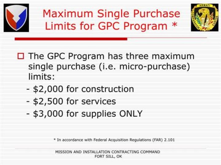 The Government Purchase Card (GPC) is widely accepted as a payment instrument for supplies and services up to $2,500. However, there are some small businesses, individuals, state and federal offices and other entities that do not accept the GPC as a method of payment.
